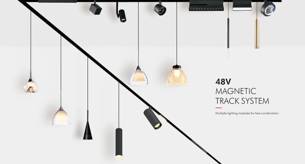 48V magnetic track lights use a low-voltage track rail embedded with conductive copper strips. LED light modules (spotlights, linear beams, pendant lights) magnetically attach to the rail and snap into position instantly.